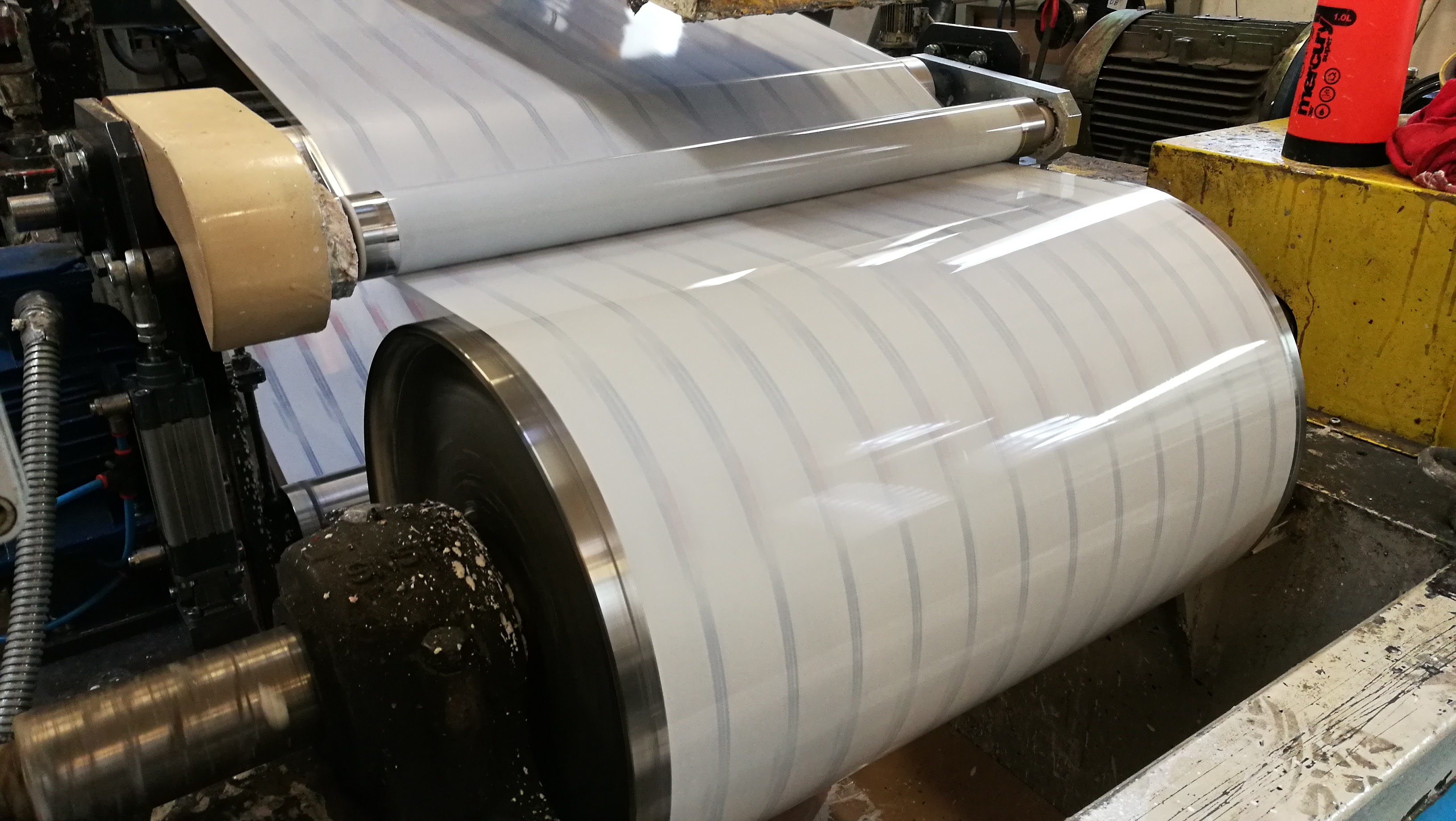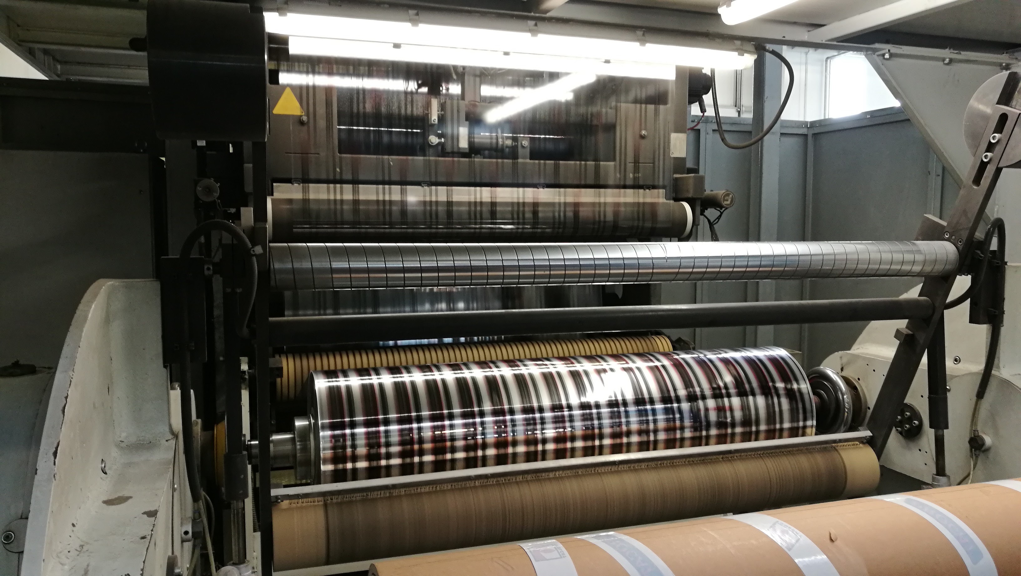 Bei der Sandwichdrucktechnik wird zuerst die biaxial orientierte Polypropylen-Folie in großen Serien in der Breite von 600 bis 1200 mm bedruckt, und erst dann wird auf der bedruckten Seite der Folie der Kleber aufgetragen.